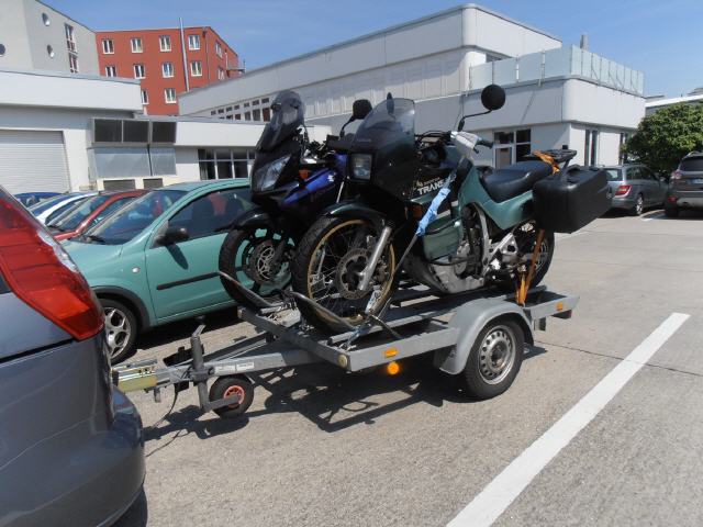 Mit unserem neu gekauften, gebrauchten Mazda 5 und einem von einem Freund geliehenen Anhänger für die beiden Motorräder sind wir über Sinsheim angereist.