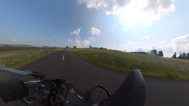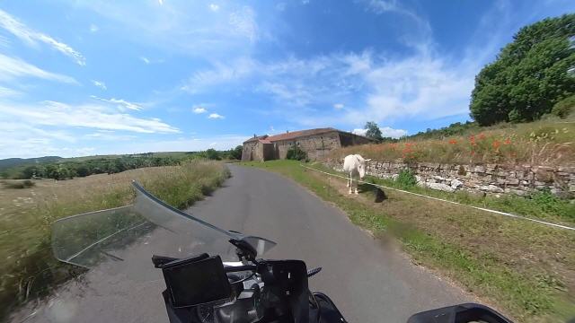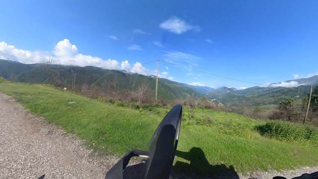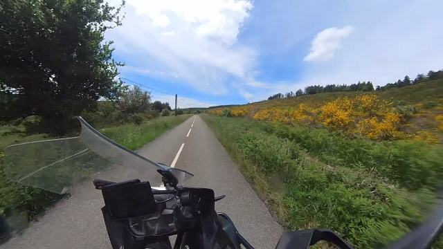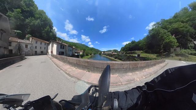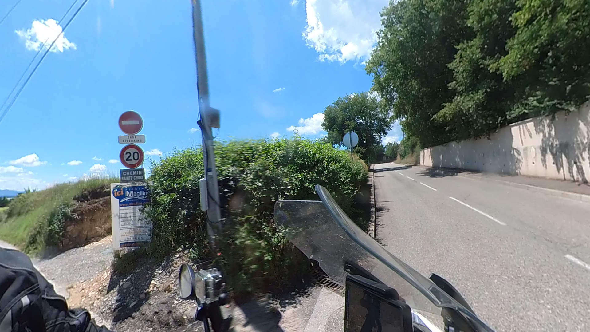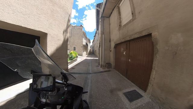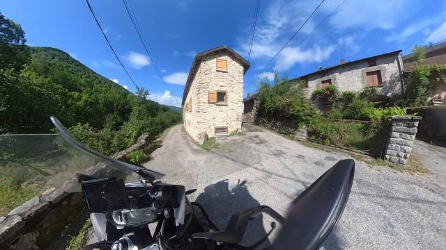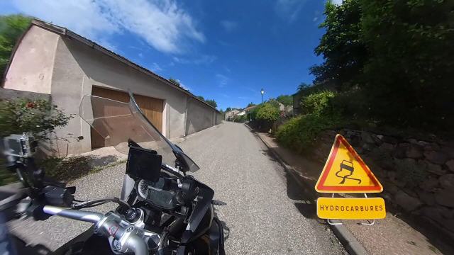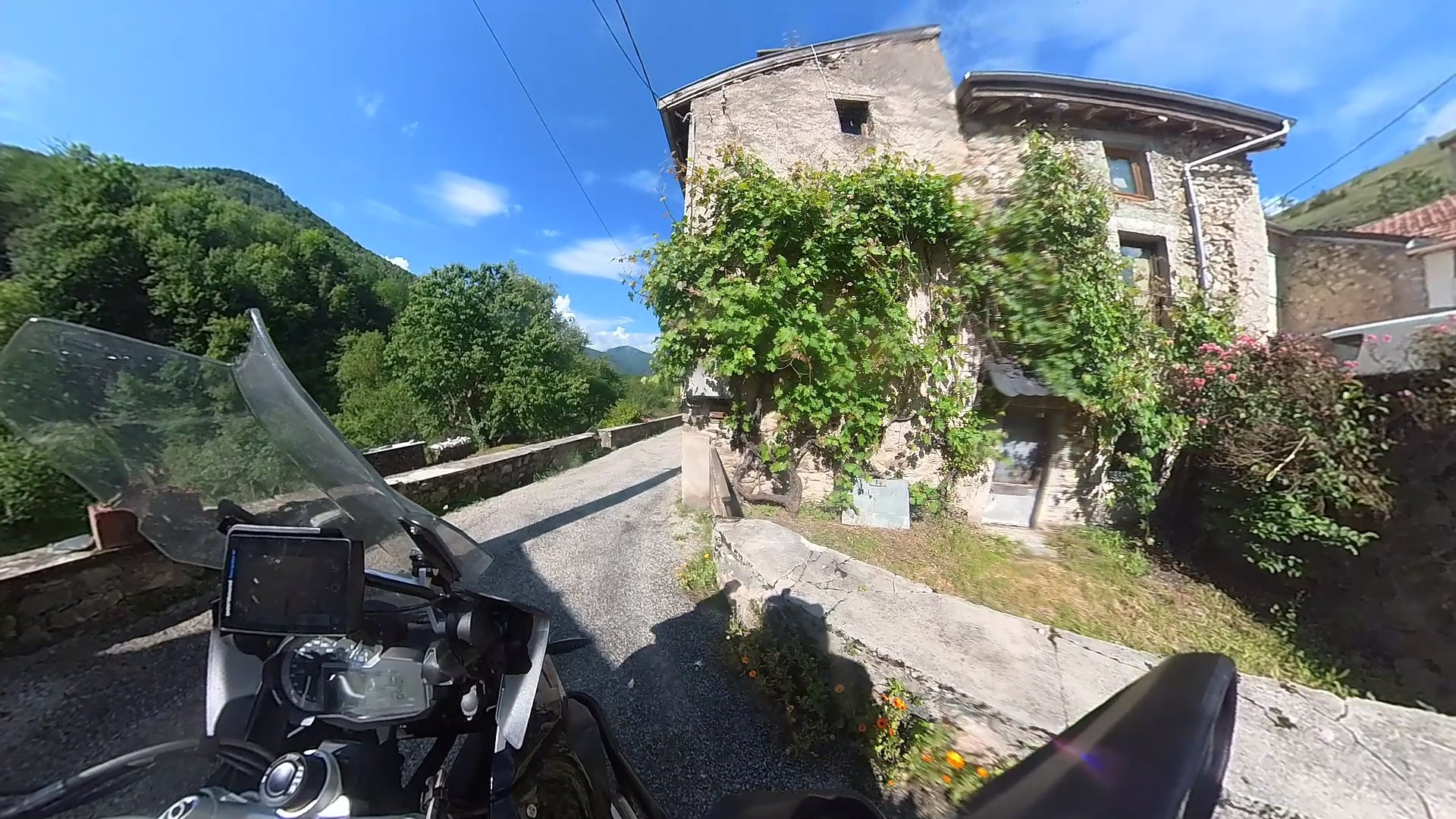Gleich nach dem Tankstopp verließ ich die N20 um auf die D44 abzubiegen. Die Straße war so schmal, das ich glaubte falsch abgebogen zu sein. Das Wetter und die Aussicht waren filmreif. Die Straße und später auch die D20 führten in größerer Höhe am Berg entlang und ließen einen weiten Blick auf die gegenüberliegenden Berge und in die Täler zu. Ein Vorgeschmack auf die vor mir liegenden Pässe setzten Endorphine und Ihre Freundinnen frei. | Manchmal führte die schmale Straße so nah an Häusern vorbei das ich befürchtete auf einem Grundstück zu landen. Mein Navi hatte Probleme die schmalen, zum Teil, durch den Höhenunterschied, so nahe beieinander liegende Straßen richtig darzustellen. Ich bin mehrere Male falsch abgebogen und musste wenden. Ich habe jedoch keinen Umweg bereut, ein Einblick in die Ortschaften oder in die gepflegten Obstgärten haben mich entschädigt. |
