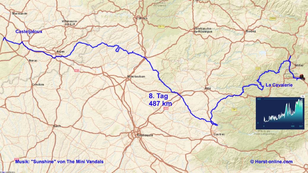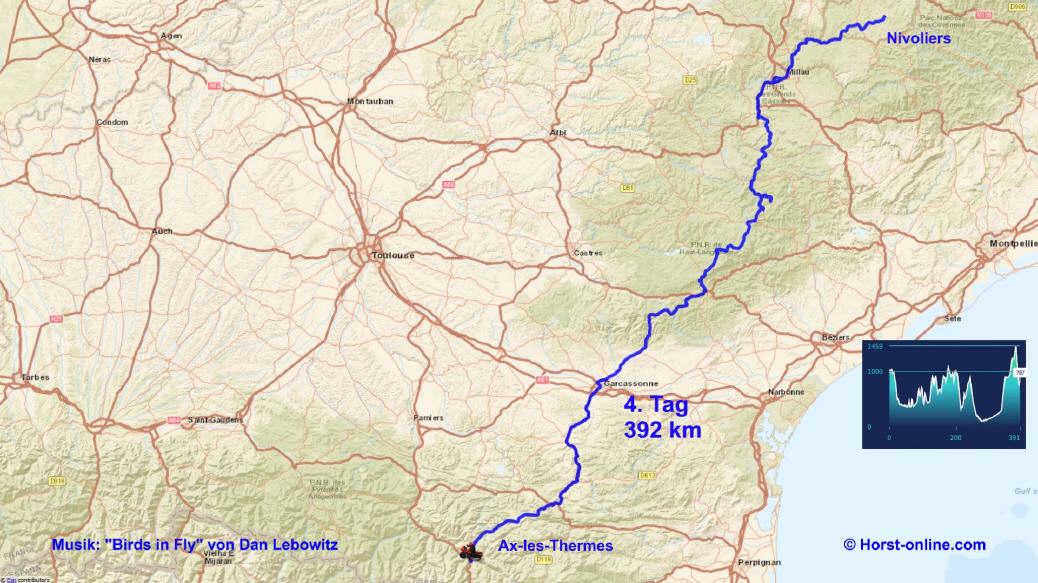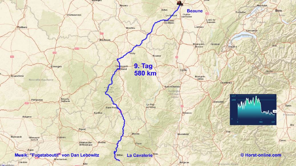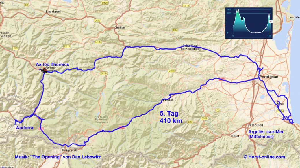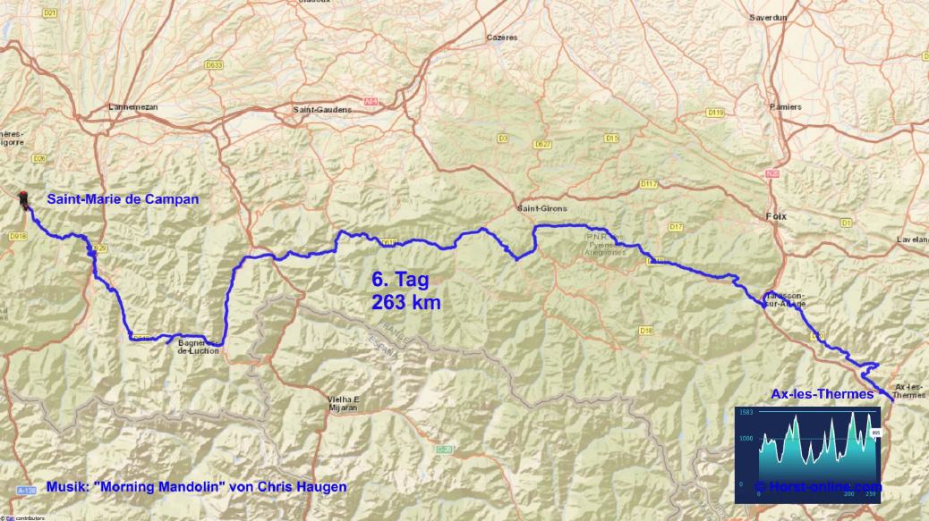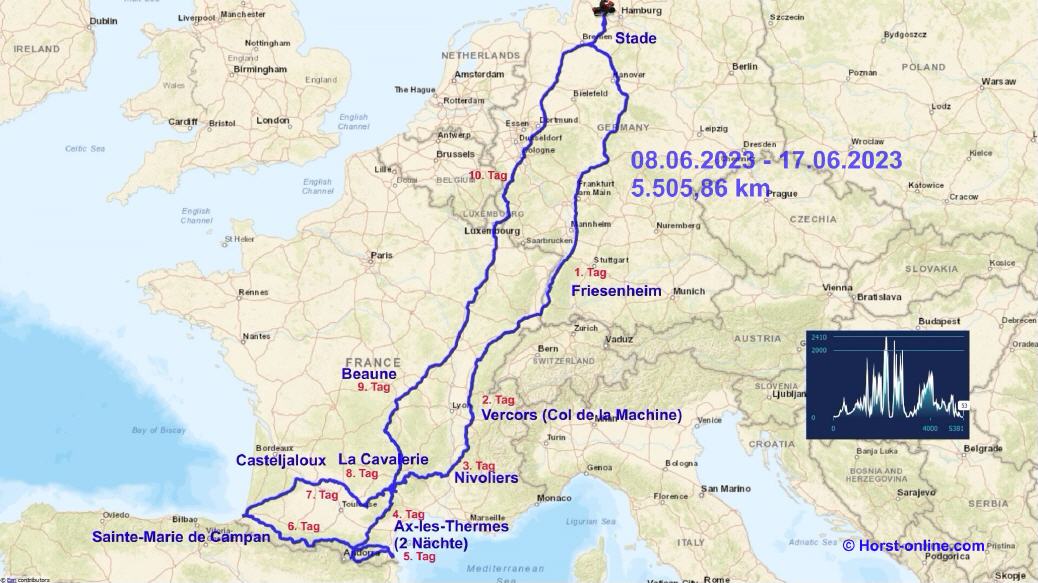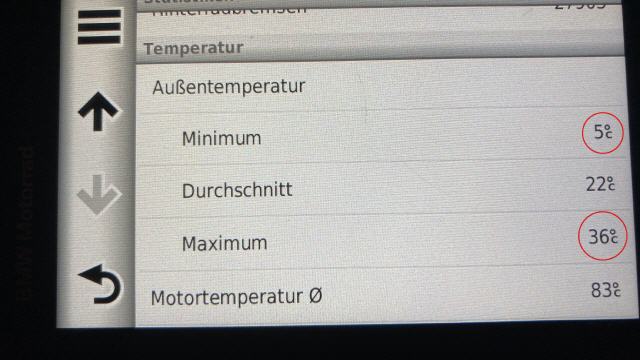 Am frühen Nachmittag traf ich die Entscheidung, mein Erlebnishunger war gestillt, leichtes „Frauweh“ setzte ein und ich wollte auch gern mal wieder in meinem Bett schlafen. Ich suchte die nächste Autobahnauffahrt und wollte so weit wie möglich nach Hause fahren. Nach 1021 km stand mein Moped gegen 1:00 Uhr auf dem heimischen Parkplatz. Mein Navi hatte ich vor der Tour leider nicht resettet, die Temperaturen waren jedoch von dieser Tour. An den ersten und letzten Tagen war es sehr warm, auf dem Weg vom Mittelmeer nach Ax-les-Thermes bin ich bei 5 Grad über den Pass und durch Regen und Hagel gefahren. |
