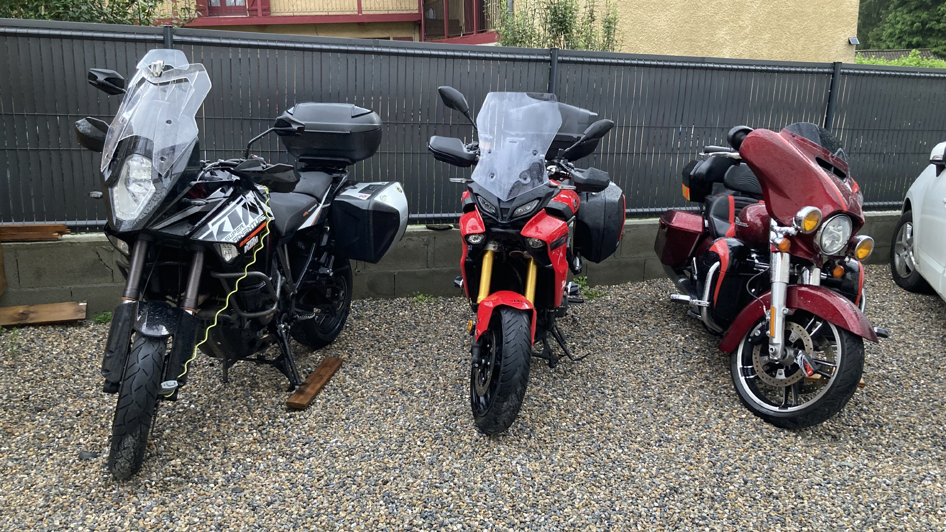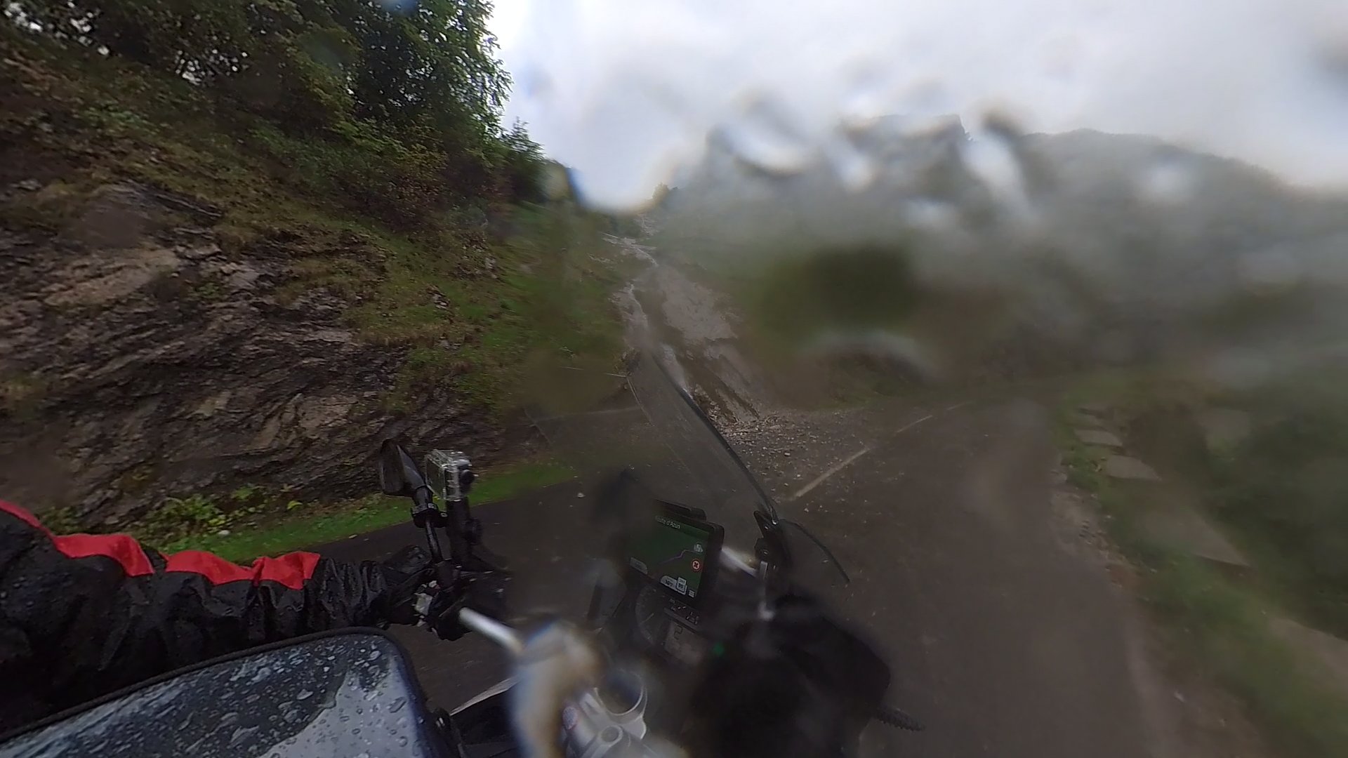 Mein Motorrad musste nun noch von der Straße auf den Parkplatz des Hotels. Dieser war frisch mit Kies aufgefüllt. Aus dem Grunde hielt ich es für sicherer das Motorrad zu schieben. Es ging leicht Bergab und das Moped rollte locker voran in Richtung Garten. Ich wollte das Motorrad dann rückwärts in eine Parklücke schieben. Die Betonung liegt auf wollte, als ich am Lenker zog, bewegte sich der störrische Esel keinen Millimeter in die gewünschte Richtung. Ok, dachte ich es ist halt zu schwer und gräbt sich in den frischen Kies zu tief ein. Lösungsansatz, Gepäck abladen, muss ja eh passieren. Also habe ich im Regen das Gepäck abgeladen und an der Hauswand gestapelt. Neuer Anlauf, gezogen, geschoben, gezerrt und gerissen, keinen Millimeter Raumgewinn in die richtige Richtung. Für eine Wende mit Motorkraft war ich leider zu nah an den Nutzgarten gerollt. Aussichtslos, ich brauchte Hilfe. Ich schleppte meine Sachen ins Hotel und traf dort auf drei Schweizer, frisch geduscht, in Badelatschen beim Biertrinken. Ich schilderte kurz meine missliche Lage und erntete Verständnis. Den Herren war es mit Ihren Mopeds ebenso ergangen. Die Hilfsbereiten Herren kamen in Badelatschen mit raus in den Regen und halfen mir mein Moped einzuparken. Ich revanchierte mich mit der einen oder andern Bierrunde. |