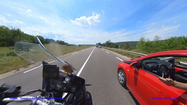 Unterwegs traf ich auf einen Autofahrer, der seine Kippe immer fleißig aus dem Fenster hielt. Ich hatte wieder mal Angst vor der Glut im Gesicht oder auf meiner Textilkleidung. Also fuhr ich neben ihn, um zu signalisieren das er das lassen solle, doch er verstand mich nicht und bot mit stattdessen einen Zug von seiner Zigarette an. |