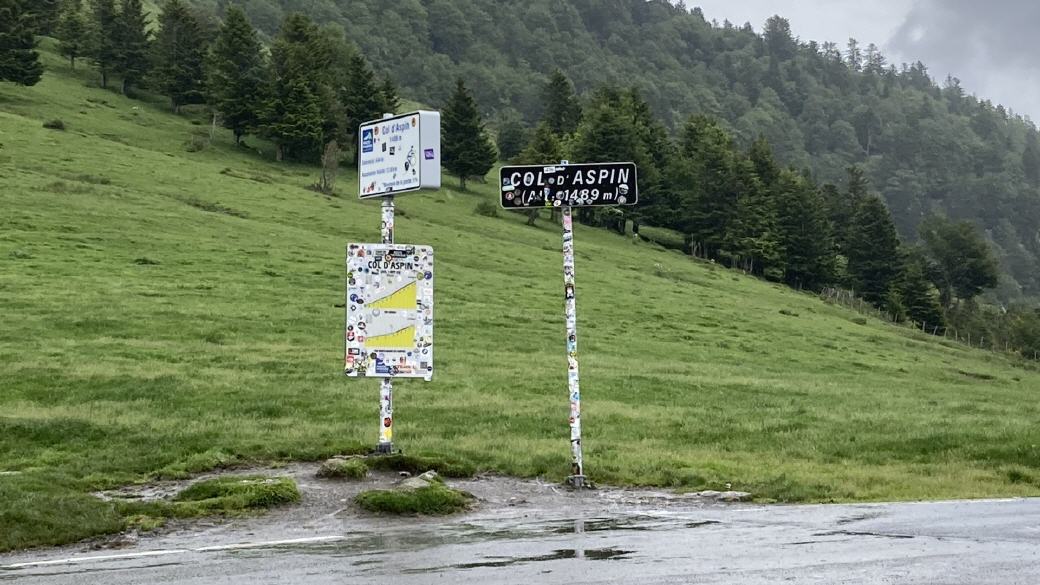 Ich näherte mich dem eigentlichen Ziel meiner Tour, den bekanntesten und schönsten Pässen der Pyrenäen. Doch je näher ich meinem Ziel kam, desto mehr sank meine Stimmung. Der Regen wurde immer stärker und die Aussicht immer schlechter. Von Fernsicht keine Rede, von Fahrspaß oder Genuss ganz zu schweigen. | Hier ein trostloses Foto vom Col d‘ Aspin mit seinen 1489 m Höhe. Er ist zwar nicht hoch doch durch die Tour de France und seiner schönen Auffahrt bekannt und beliebt. An diesem Tag schienen sich alle Anwesenden nur vor dem Regen und dem Wind zu ducken und hatten eher das Bedürfnis diesen unwirtlichen Ort zu verlassen. So sahen die Wanderer jedenfalls aus als sie zielstrebig in den zur Abholung bereitgestellten Bus sprangen. |