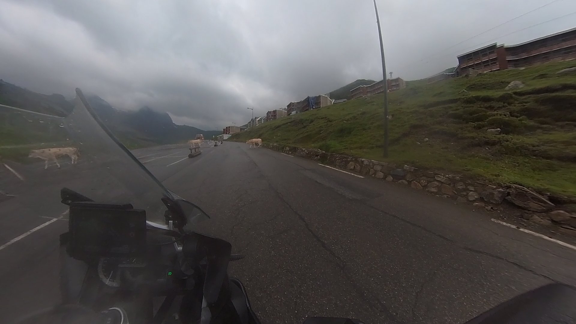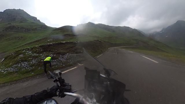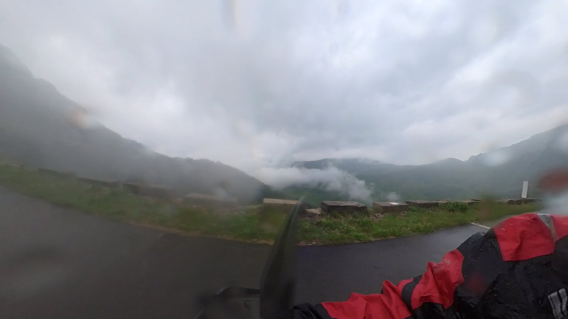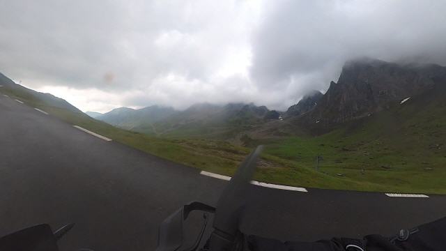 Nach dem Frühstück trennten sich unsere Wege. Die Schweizer wollten dem Flus Lot in Richtung Osten folgen. Das Wetter hatte sich ein wenig gebessert, meine Filmaufnahmen sind jedoch eher geeignet depressive Stimmungen zu verstärken. Ich war tatsächlich gefrustet, das Highlight, auf das ich mich seit Monaten freute, versank in Nebel und Regen. Die Kühe in La Mongie, dem letzten Ort vor dem Pass des Col du Tourmalet, erheiterten mich auch nur ein wenig, immerhin hatten die die Ruhe weg und sorgten bei mir für ein wenig Entschleunigung. Hier fasste ich den Entschluss auf jeden Fall bis Biarritz zu fahren. Ich hatte die Hoffnung dort besseres Wetter vorzufinden. Der Pass empfing mich mit einer riesigen Baustelle, und einer wolkenverhangenen Aussicht. Ok, ich muss hier nochmal herkommen, heute ist hier nichts zu holen, akzeptieren und weiter. |