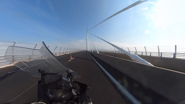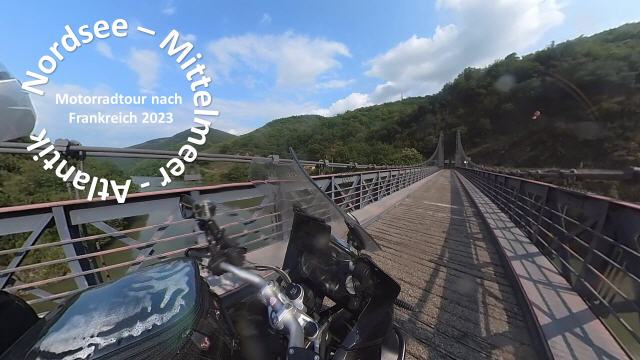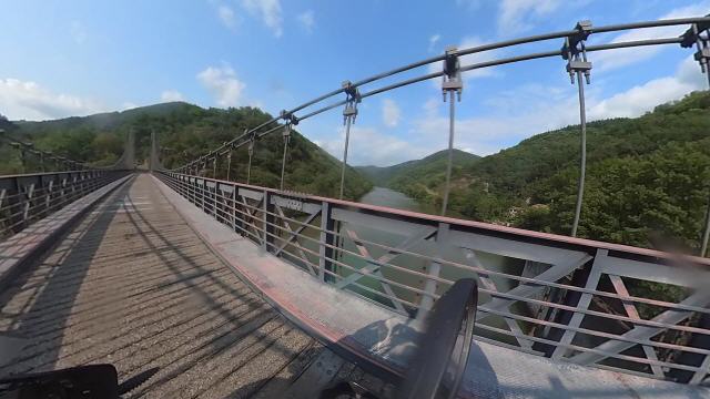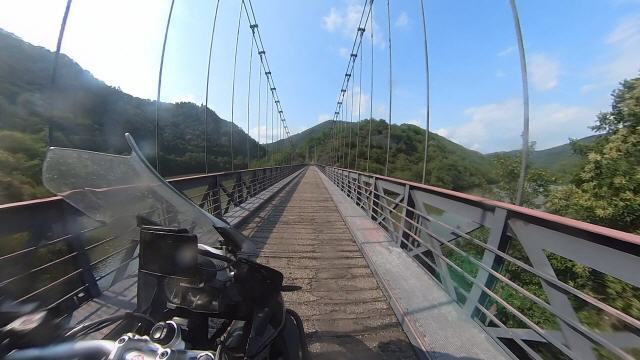 Am spektakulärsten war die Fahrt über diese alte Hängebrücke. Sie lag zwar nicht auf meiner direkten Strecke, doch ich bin einfach abgebogen und hin- und her darübergefahren. Die Holzbohlen klapperten unter den Rädern, ich fand, es war ein kleines Abenteuer, insbesondere für jemanden mit Höhenangst, der auch schon auf die Mühle geklettert war. |