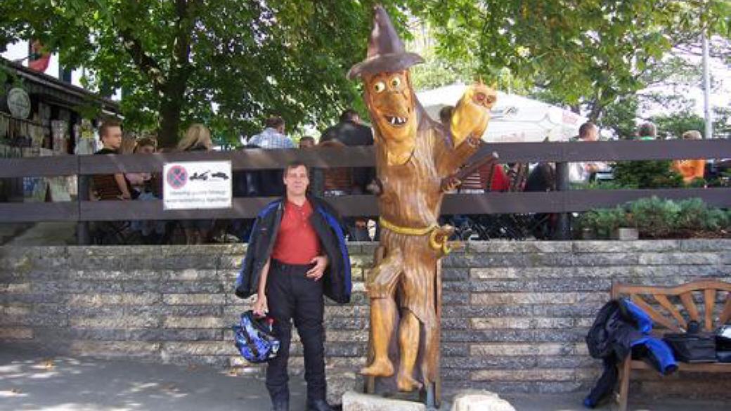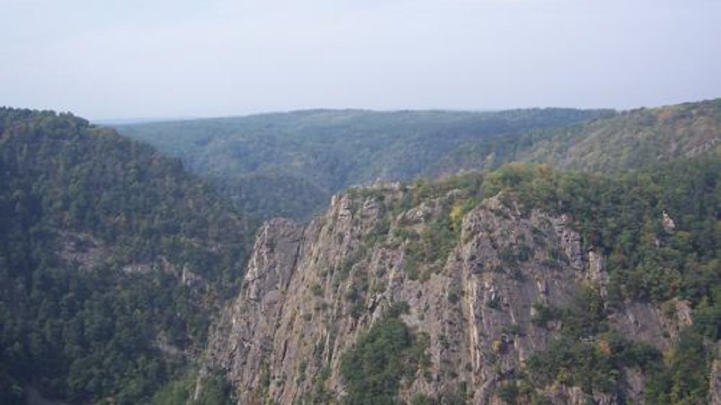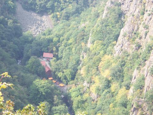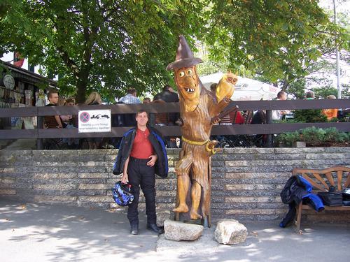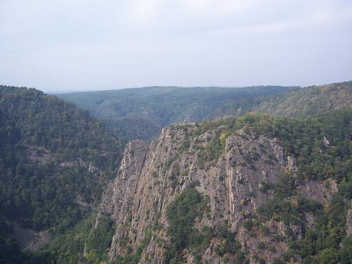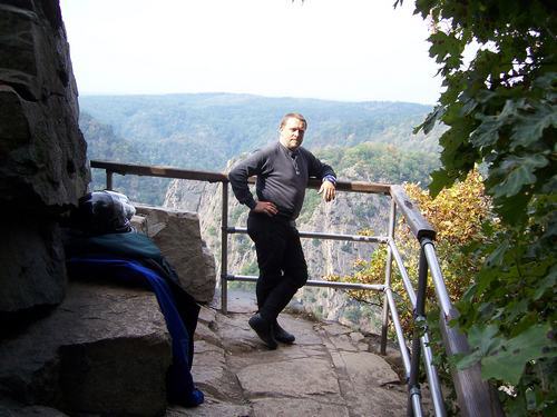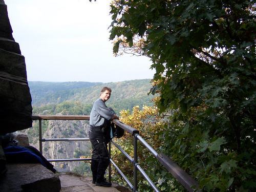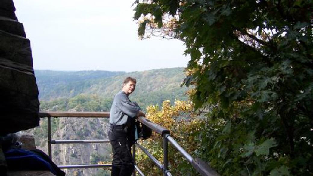 Nach einem guten und gemütlichen Frühstück begannen wir bei bestem Wetter unsere Samstagstour. Zuerst einmal fuhren wir von Tanne über Trautenstein nach Hasselfelde. Hier wurden die Maschinen betankt. Auf der Tankstelle herrschte ein reger Betrieb, denn etliche Motorradgruppen waren bei diesem schönen Wetter unterwegs. Sie nutzten die Möglichkeit hier zu tanken, um dann ihre Tour von hier durch den Harz oder zum Kyffhäuser fortzusetzen. Wir fuhren in der Gruppe über Stiege, Güntersberge, Siptenfelde, Alexisbad und Mägdesprung nach Gernrode. Die Straßen waren wie in den letzten Tagen auch gut zu befahren. Das Kurvenfahren machte richtig Spaß. Die Sonne zeigte sich von seiner besten Seite und so brachte das Biken in der Gruppe richtig Laune. Jedenfalls bis kurz hinter Bad Suderode. Wir fuhren in der Reihenfolge wie in den Tagen davor auch. Doch hinter Bad Suderode bekam ich langsam einen dicken Hals. Immer wenn es auf freier Strecke zügig voran gehen sollte, wurde mein Vordermann langsamer. Wo 100 km/h erlaubt waren bewegten wir uns teilweise mit 60 km/h voran, ohne ersichtlichen Grund. Es gab keine schlechten Wegstrecken oder andere Hindernisse. Das brachte mir nun keinen Spaß mehr, zumal ich manchmal abbremsen musste, sonst hätte ich überholen müssen und das ist in der Gruppe tabu. Diese ganze Geschichte bekam unser Scout wohl mit, denn er legte erst einmal einen nicht geplanten Stop am Hexentanzplatz ein. Hier gibt es richtig etwas für Touristen zu sehen und zu erleben. Es gibt Stände mit Andenken, Getränkebuden und Wurstbuden. Überall kann man stehen bleiben und sich etwas ansehen. Besonders beeindruckend war die Aussicht von oben ins steile Tal zu schauen. Von hier oben geht es mehrere hundert Meter steil hinab. Vom Hexentanzplatz kann man zur Rosstrappe hinüberschauen und die Leute dort beobachten, die mit einer Seilbahn zur dortigen Aussichtsplattform hochgefahren waren. Es war schon schön. |