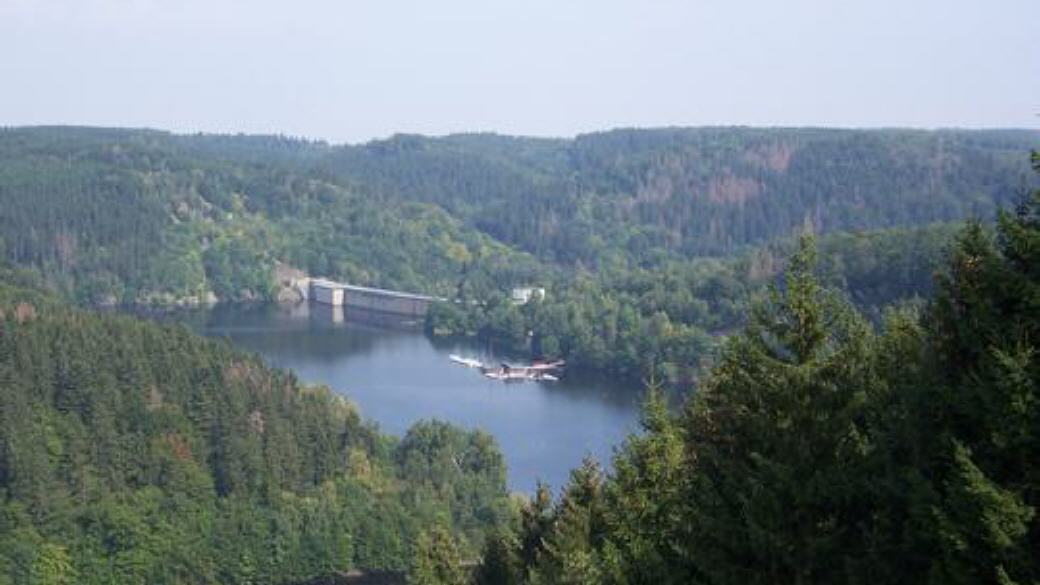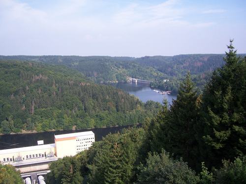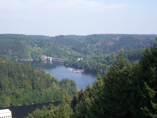 Ganz langsam verrauchte mein Unmut. Langsam machten wir uns dann auf den Rückweg zu den Maschinen. Auf den Weg dahin genoss ich noch ein leckeres Eis. Schließlich machten wir uns auf den Weg Richtung Rübeland. Vom Hexentanzplatz ging es über Thale, Treseburg, Altenbrak und Wendefurth zum Stahlberg. Hier besichtigten wir noch einen Stausee, an dem Strom produziert wird. Dazu wird Wasser in ein oberes Staubecken gepumpt und bei Bedarf durch dicke Rohre ins Tal gelassen. Unten am Fuße der Fallstrecke, treibt das Wasser dann die Turbinen an. Von oben hatten wir einen schönen Blick auf die Fallrohre und den unteren Stausee, auf denen Boote unterwegs waren. |
