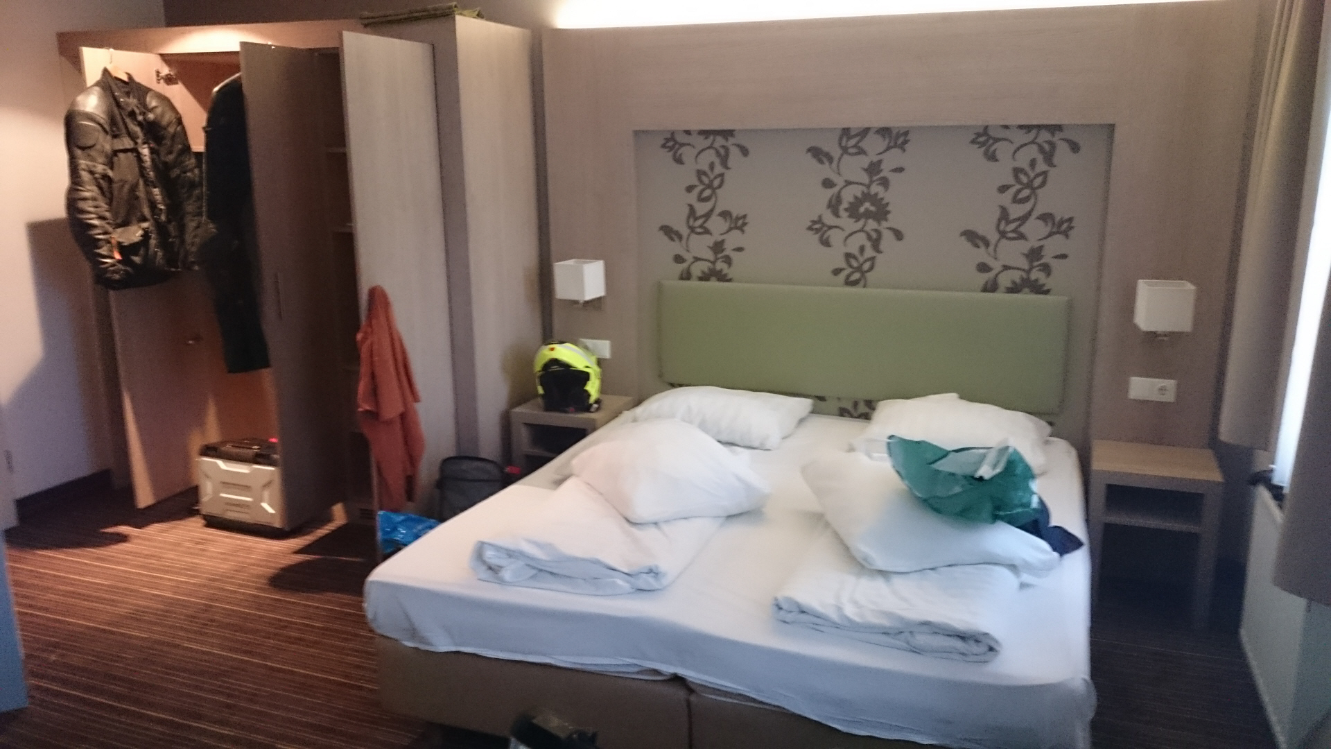 In dem Bett habe ich sehr gut geschlafen, nur der in der Nacht einsetzende Regen trübte ein wenig meine Träume. Nach einem reichhaltigen Frühstück freuten wir uns über den Regenschutz über den Motorrädern, das gestaltete das Packen etwas angenehmer. Bei stärker werdendem Regen brachen wir auf. Bei dem Wetter gibt es nur eine Entscheidung, ab zur nächsten Autobahnauffahrt und Kitt bis sich das Wetter bessert. Das tat es dann auch, etwa die Hälfte der fast 600 km legten wir im Trockenen zurück. Zu berichten gibt es über eine solche Autobahnetappe nichts wirklich Spannendes. Wir haben uns die Tour gut eingeteilt. Etwa alle 200 km haben wir ein Päuschen eingelegt um dann wieder das Handgelenk einzurasten um das Asphaltband abzuspulen.
