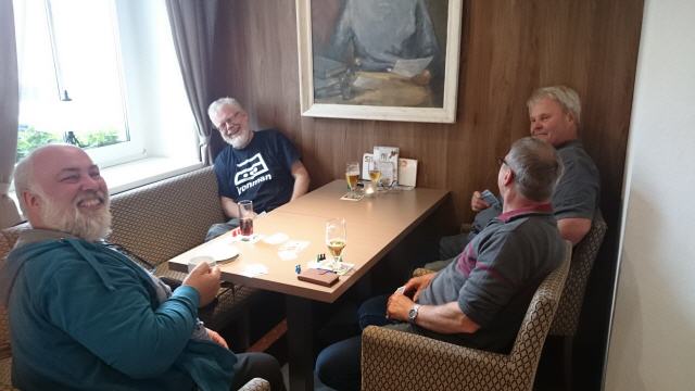 3. Tag Das Frühstück lies uns mit Wehmut an die Unterkunft in Goslar denken. Ein Blick aus dem Fenster konnte die Stimmung auch nicht positiv beeinflussen. Es regnete „junge Hunde“. An eine genussvolle Tour war an diesem Tag nicht zu denken. Wenn schon, in die noch nassen Klamotten steigen, dann wenigstens mit Aussicht auf eine trockene Piste. Plan B musste her. Ich wollte ein paar vergessene Kleinigkeiten einkaufen und einen Friseur aufsuchen. Das mit den Kleinigkeiten hat geklappt, doch einen Friseurtermin konnte ich nicht ergattern. Von vier Friseurgeschäften in dem kleinen Ort hatte Eines Ruhetag, logisch, war ja Freitag, und die anderen waren für diesen Tag ausgebucht. Der Rest von Plan B spielte sich dann im Hotel ab. Das „Peinlichbändchen“ galt ja den ganzen Tag. Also, Kaffeetrinken, Kartenspielen und rechtzeitig auf Bier umstellen. Nicht gerade der beste Tag in unserer Tourengeschichte. Aber lustig war es dann doch. |