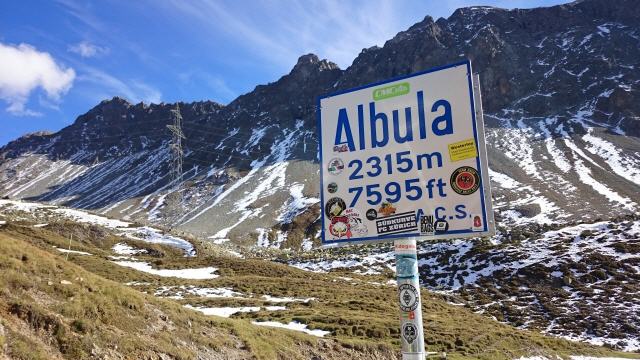Dann haben wir in Davos getankt. Da vos so teuer war. Von Davos aus folgeten wir der 417 und der 749 auf den Albula. Ab Bergrün hat man häufig Sicht auf die atemberaubende Bahntrasse und gelegendlich kann man Züge auf dieser Bergstrecke beim Erklimmen der Höhe beobachten. Die Straße kreuzt die verschlungene Bahnlinie häufig. |