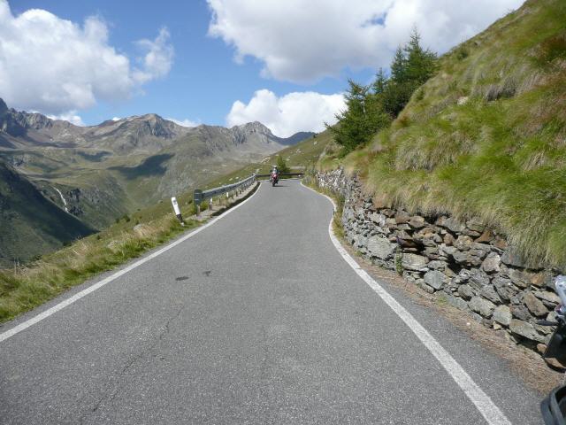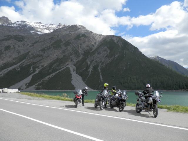 6. Tag Die Jungs scharrten schon mit den Hufen, das erste Ziel war das Stilfser Joch. Ich musste mich leider noch bei einem Kunden aufwählen und ein wenig arbeiten. Ich wünschte den Jungs schon mal viel Spaß und glaubte sie auf der Strecke irgendwann einzuholen. Ich hatte Glück, die „Herausforderung“ war nicht so groß und ich konnte mit etwa einer halben Stunde Verspätung hinterherbratzen. Ich wollte es ruhig angehen lassen und es dem Zufall überlassen ob ich meine Jungs irgendwo einhole. Auf der B180 und SS40, vorbei am Reschen See, genoss ich das gute Wetter und den Sonnenschein. Doch kaum auf italienischer Seite spürte ich schon den Druck der einheimischen Motorradfahrer. Scheinbar nur zufrieden, wenn sie ihre Reifen am Nummernschild des Vorausfahrenden warmschleifen können. Ich wollte es ruhig angehen, ja ich wollte. Nun befand ich mich mittendrin statt nur dabei. |