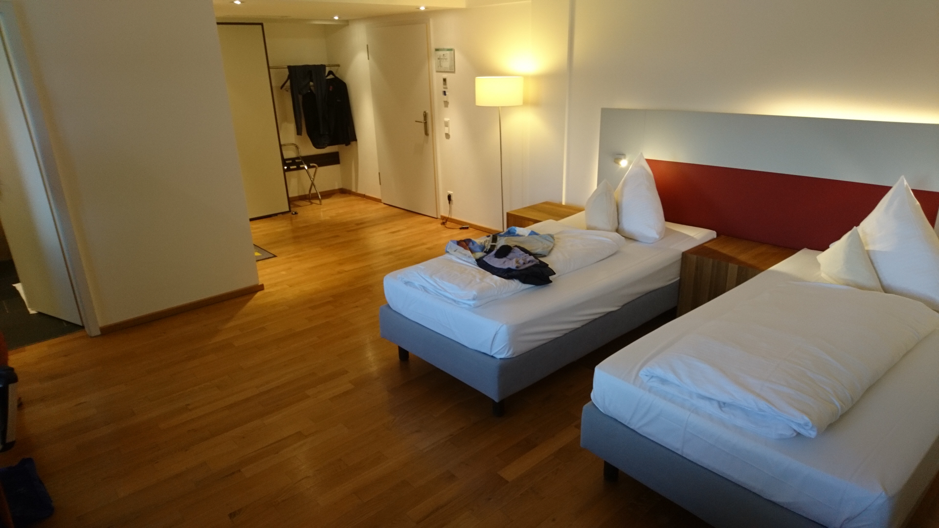 Das Bett, das Bernd P. und ich uns teilten, war ein typisches Monteurbett. Die linke und die rechte Seite waren durchgelegen und in der Mitte ein großer Berg. So formen sich Matratzen, wenn die Nutzer Körperkontakt meiden. Ich hatte die ganze Nacht das Gefühl an einem Berghang zu schlafen. Das Frühstück war mit Abstand das schlechteste auf unserer Tour. |