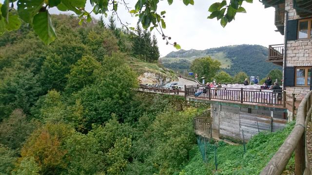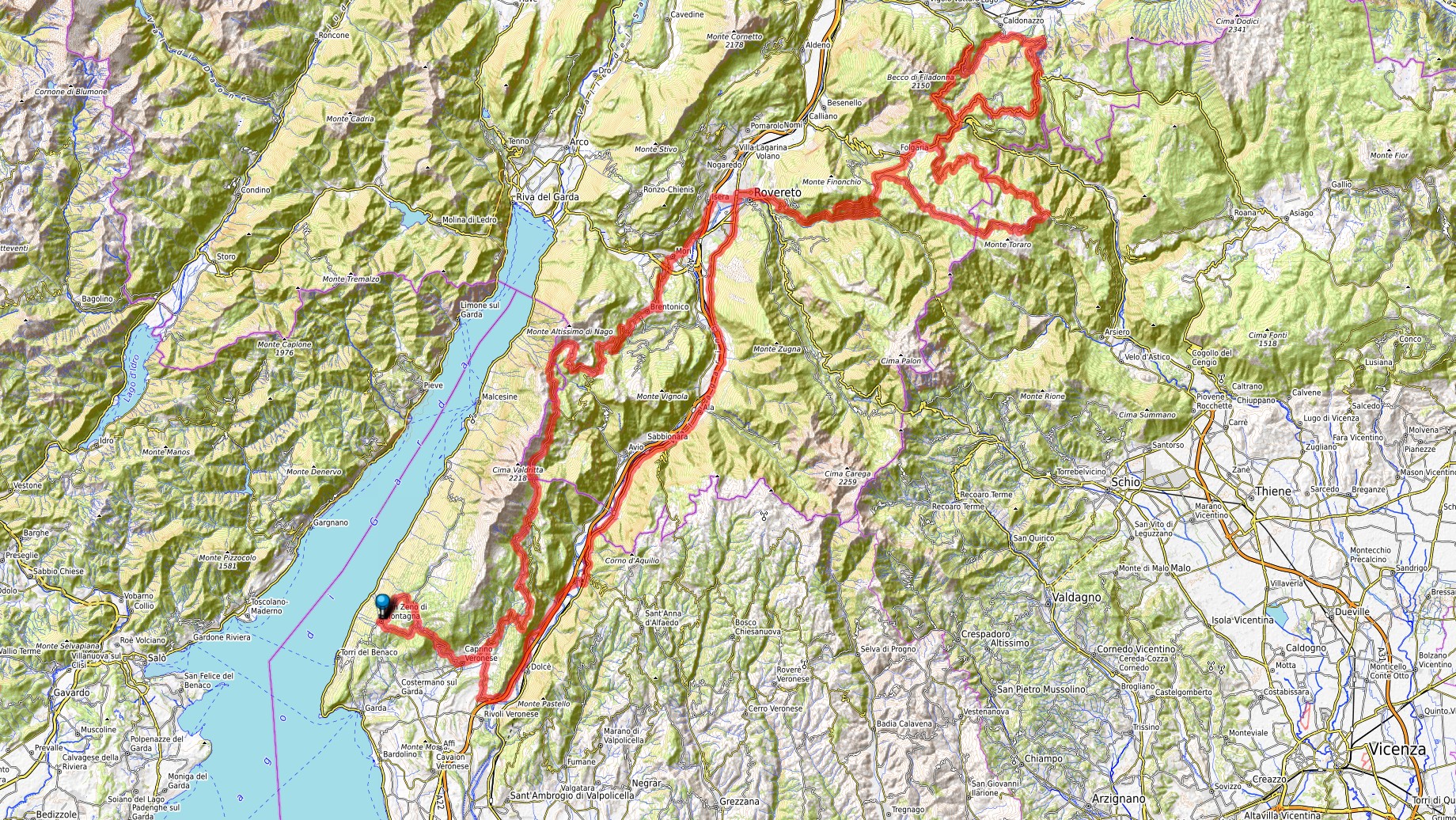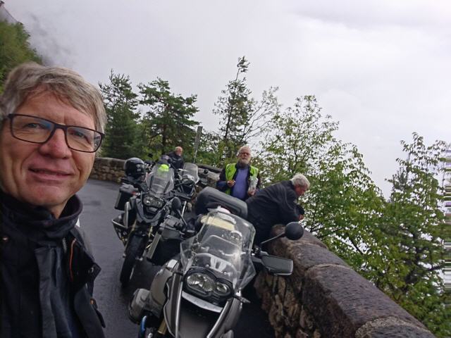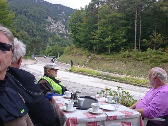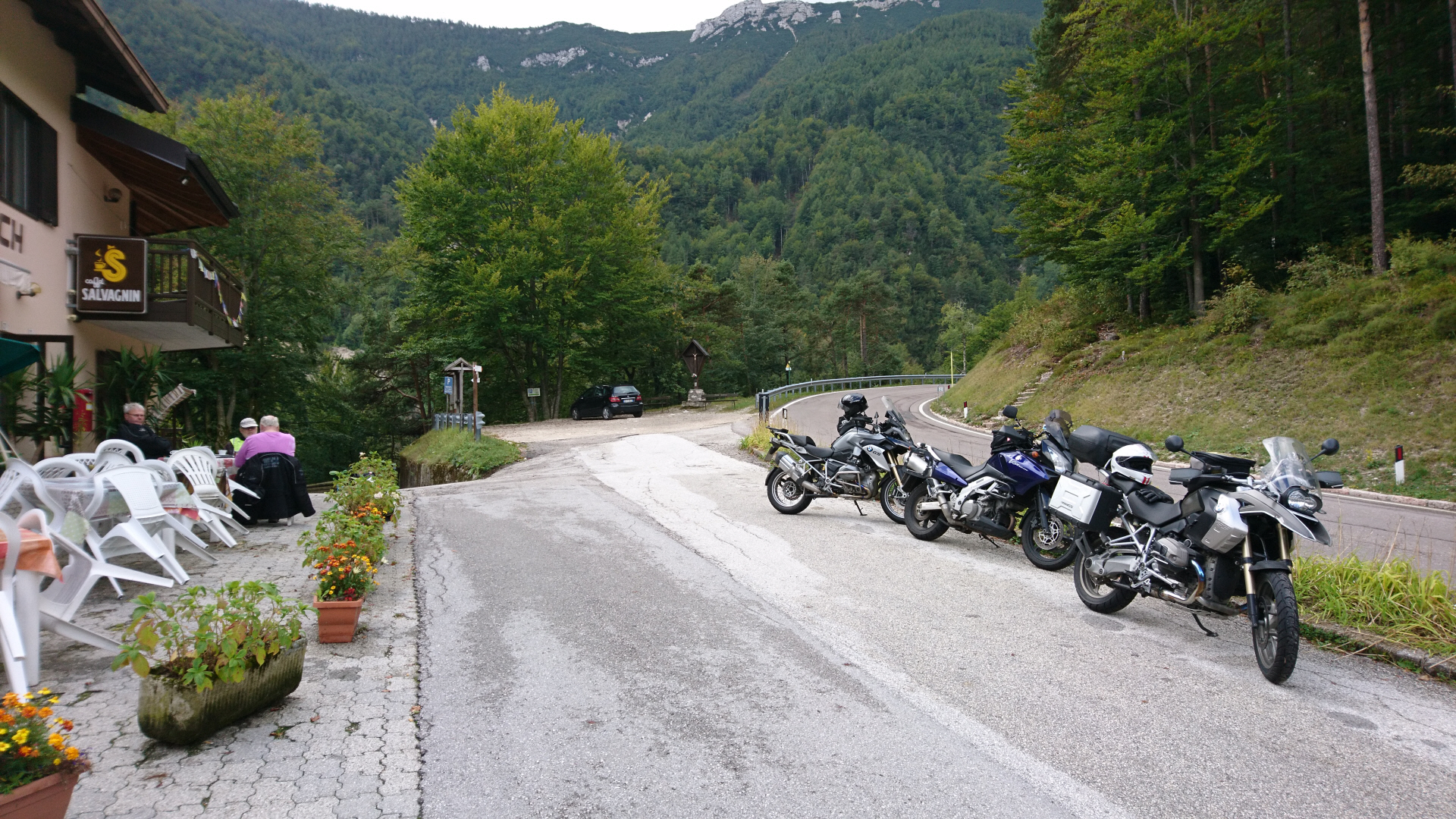 6. Tag Rundtour vorbei am Monte Baldo und vielen anderen Montes fuhren wir über kleine kurvenreiche Straßen nach Rovereto. Auf der SP143 und SP142, also über wunderschöne Umwege, in Richtung Norden. Das Ziel war die Kaiserjägerstraße in der Nähe von Caldonazzo. 2016 sind wir die Straße von Süden nach Norden gefahren, in diesem Jahr andersherum. Vor zwei Jahren haben wir uns verfahren und gefühlt eine Ewigkeit nach der Straße gesucht. Dieses Mal haben wir sie sofort gefunden. Für die Dauer eines kurzen Regenschauers haben wir eine kleine Stärkungspause eingelegt. Die Straßen sind nach dem kleinen Schauer schnell wieder abgetrocknet. |