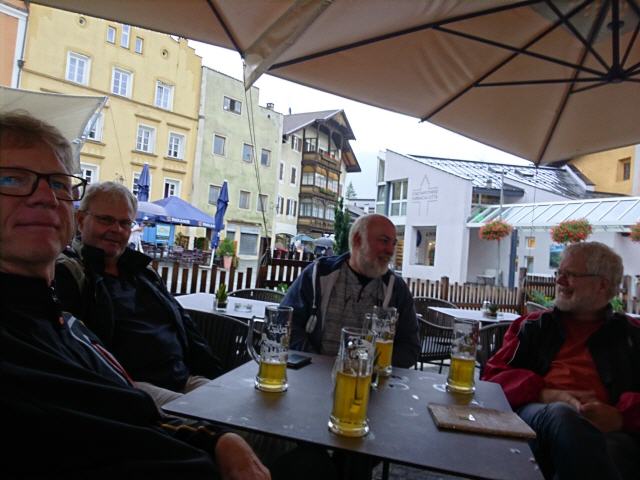 Im Bahnhof war zum Glück eine Gaststätte a la Hofbräuhaus mit Klimaanlage. Klasse, erstmal Trinken und was essen. Nun ging es uns wieder besser. Der Laden füllte sich zunehmend, vor allem mit Motorradfahrern. An unserm großen Tisch war noch Platz und so gesellten sich zwei Motorradfahrerinnen zu uns. Die Beiden kamen aus der Toskana und berichteten von ihren tollen Touren und der schönen Landschaft. Die Wartezeit verging bei dem guten Gespräch auf angenehme Weise wie im Fluge. Zum Abschied nahmen wir sechs uns spontan in die Arme und haben uns über diesen netten Kontakt aufrichtig gefreut.