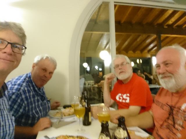 Wir bestellten wie es für Männer so üblich ist, alle das gleiche Bier und die gleiche Pizza. Die Wartezeit überbrückten wir dann mit mehrfachem in die Höhestrecken von vier Fingern, läuft. Die Pizza war wirklich lecker, nach einem Absacker, einem Nachtisch und dem Genuss eines Scheidebechers reservierten wir für den folgenden Abend einen Tisch. |