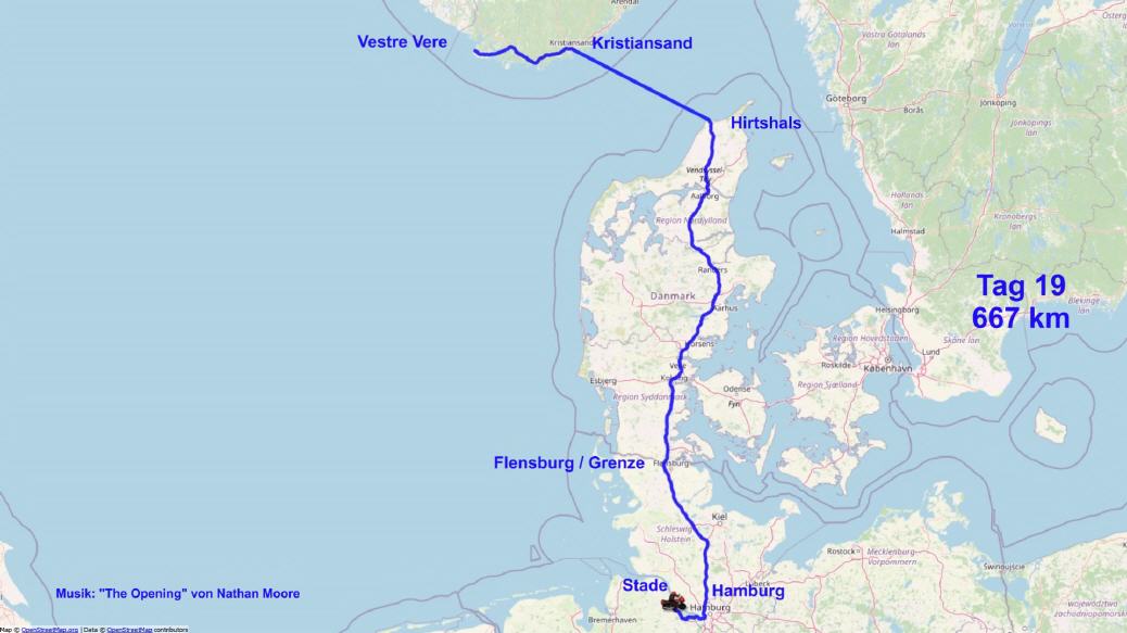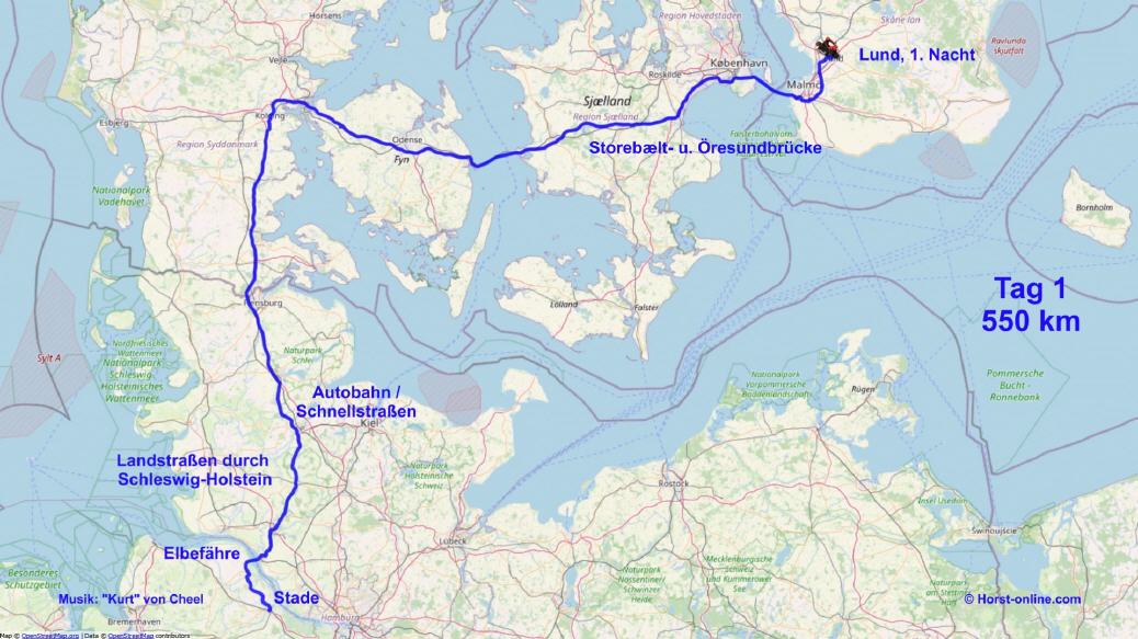 Der Grund dafür, dass ich länger für meine Tour nach Norden benötige als Bernd P., ist die Wahl meiner Route. Ich wollte nicht mit den großen Fähren fahren, sondern möglichst viel Strecke selber erfahren. Langer Landweg mit vielen besonderen Brücken nicht nur weil ich das Risiko von Seekrankheit minimieren wollte, sondern auch weil ich die großen Brücken gerne sehen wollte. Daher führte mich meine Route über die Elbefähre und über kleine Straßen durch Schleswig-Holstein. |