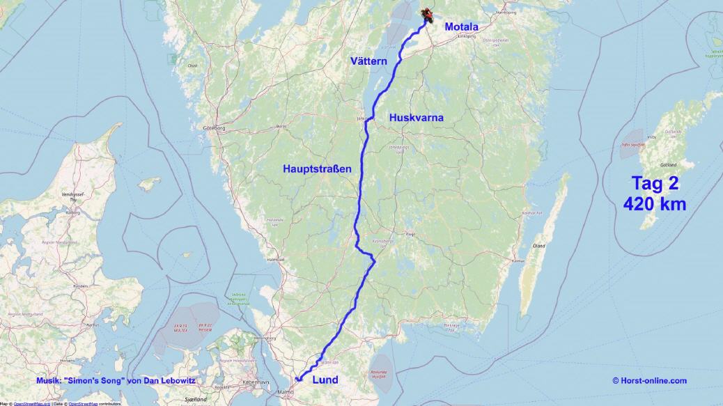 Als ich den Vättern, einen der größten Seen Schwedens erreichte, wurde aus dem Regen heftige Schauer und Wolkenbrüche. Ich fuhr daher auf die autobahnähnlichen E4. Obwohl es bis Motala, meinem nächsten Ziel, nicht mehr weit war, gönnte ich mir eine Kaffeepause und wärmte mich ein wenig auf. Auf den beeindruckenden See erhaschte ich gelegentlich Ausblicke, die die Größe erahnen ließen, doch einen großen Teil der Zeit, die ich an diesem See entlangfuhr, betrachtete ich eine graue Wand, die wenig Inspiration in die Augen des Betrachters projizierte. Kurz vor meinem Ziel, abgelenkt von dem Regen, verpasste ich die richtige Abzweigung. Das bescherte mir eine Fahr über die „Motalabron Bridge“, die mir zwar eine schöne Aussicht bot, doch wenn ich es richtig gelesen habe, wurde für dieses Hin- und Her, eine Mautgebühr fällig, dumm gelaufen. |