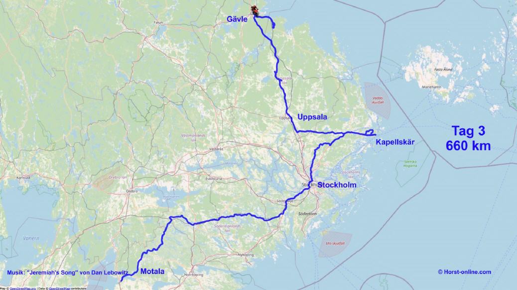 Wie schon erwähnt, hat es den ganzen Tag mehr oder weniger geregnet. Mal eben am Straßenrand stoppen und Pipimachen war schon eine Herausforderung bei den vielen Klamottenschichten. Die Wärme hatte sich auch verkrümelt. Die trockensten Stellen des Tages waren unter den Dächern der Tankstellen. Ich habe hier auch nur wenige Bilder abgelegt, ich möchte nicht die Schuld an aufkommenden Depressionen bei interessierten Lesern bekommen. Die extrem langen LKWs haben mich schon beeindruckt, jedoch einen noch stärkeren Auftritt hatten die schwedischen Goldwingfahrer. Warum sind die in kurze Hosen unterwegs? Wollen die ihre Schutzkleidung vor dem Wetter schützen oder tragen sie die Klamotten, weil laut Kalender Sommer ist? Bei dem Anblick habe ich die Griffheizung noch eine Stufe höhergestellt und mich noch tiefer hinter der Scheibe verkrochen. |