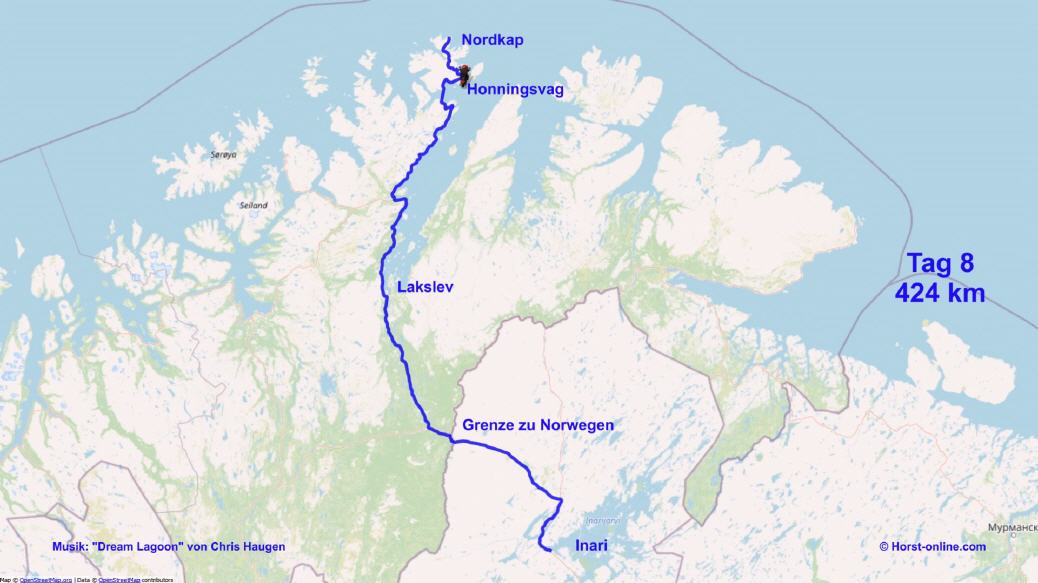Nach dem tollen Frühstück empfing mich die Straße mit allerbestem Wetter und ich strahlte mit der Sonne um die Wette. "Nordkap, ich komme". Mein heutiges Ziel: Honningsvåg und das Nordkap. An dieser Abzweigung wird das Ziel schon mit Entfernungsangabe angezeigt, nur noch 343 km. |