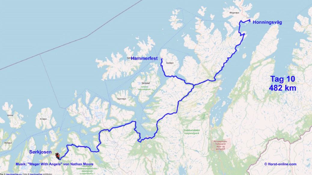 Nun habe ich den Porsagerfjord erreicht. Er ist 123 km lang und mündet in die Barentssee. Dieses nördlichste Gewässer, das ich auf dem Landweg erreichen kann, gehörte ebenfalls auf meine „Bucket List“. Haken dran, und zum Nordkap ist es nun auch nicht mehr weit. Der Fjord hat mich sehr beeindruckt, zum einen mag es an dem Wetter gelegen haben, die Sonne verlieh der Szenerie einen sehr besonderen Glanz, zum anderen, weil es wieder ein Meilenstein meiner Reise war und sich eine große Zufriedenheit in mir ausbreitete. Es roch angenehm nach Salz und Meer. Auf einer der Sandbänke glaubte ich ein Rentier gesehen zu haben, mal etwas anderes, statt Seehunde liegen hier Rentiere im Sand. |