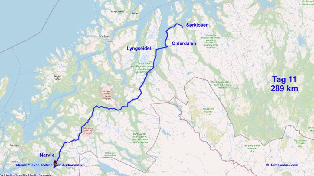 An diesem Tag bin ich 482 km gefahren. Ich war lange unterwegs, es war streckenweise sehr warm und ich habe viel geschwitzt. Zum Abend hin wurde der Himmel dunkler, es sah aus, als wenn es bald regnen solle. Darauf hatte ich keine Lust. Als ich an der Straße „Henriksen Gjestestue AS“ erblickte, bog ich ab und fragte dort nach einem Zimmer. Der Herr hinter dem Tresen meinte, er hätte noch ein Zimmer frei, der Preis war ok. Das Zimmer war zwar nicht sehr groß, doch sauber und zweckmäßig mit neuen Ikea Möbeln ausgestattet. Zum Essen musste ich noch ein paar Meter fahren. Im Restaurant saß ich dann auf einem Balkon mit Aussicht über den Hafen. Als ich das mit Selbstbedienung und der etwas merkwürdigen Bestellabwicklungslogistik abgerafft hatte, musste ich nur noch lange warten, bis der Burger dann fertig war. Die Wartezeit wurde jedoch durch ein Ehepaar verkürzt, das mich vom Vorabend aus dem Hotel bei Honningsvåg wiedererkannte und ein Gespräch mit mir begann. Sie mussten ebenfalls lange warten und hatten, obwohl sie einen Hund dabeihatten, noch Interesse an Zweibeinern. Auf dem Parkplatz neben meinem Moped übernachtete eine Enduro mit einer Sonderlackierung. Der Name des Fahrers stand auf dem Tank. Er hatte ein deutsches Kennzeichen, sprach jedoch nur Englisch und hatte leider kein Interesse an einer Konversation. „Khalid al Jaber“ |
