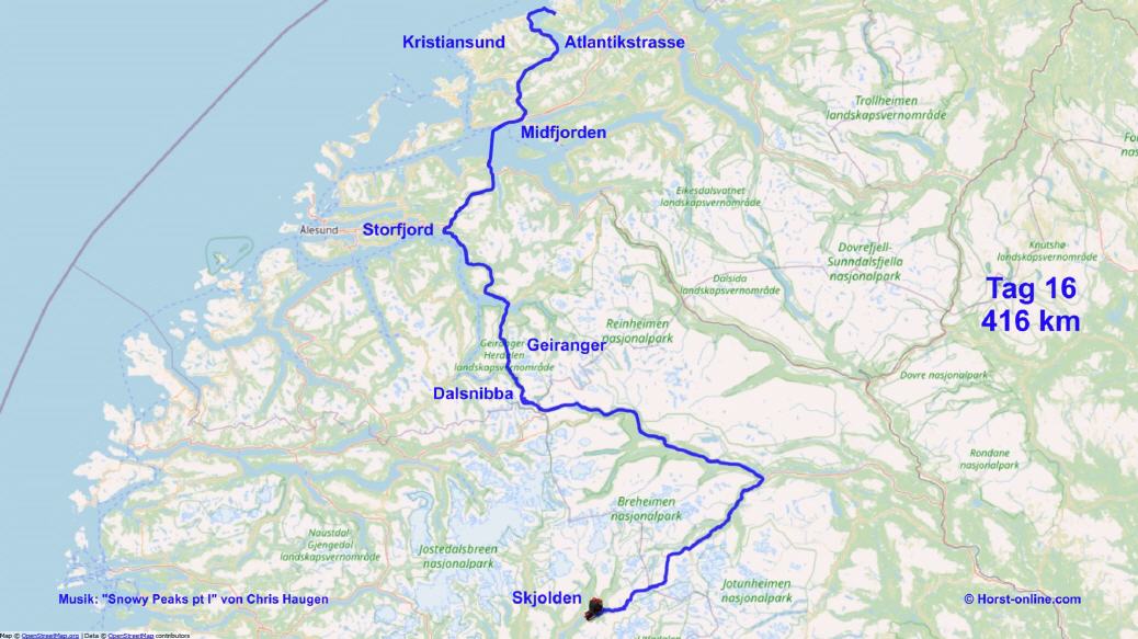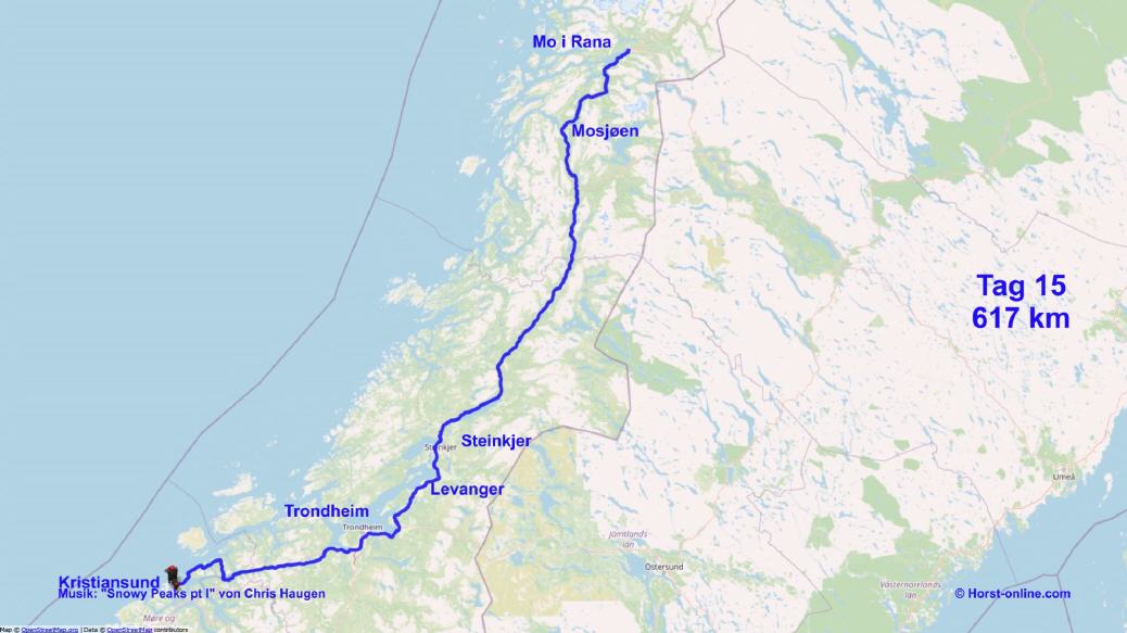 Das Frühstücksangebot war klein, aber fein, und die Einrichtung des Frühstücksraums war ein echter Hingucker. Teilweise waren die Tische wie ein Teil eines Bahnwaggons eingerichtet. An den Wänden waren Gepäckablagen mit alten Koffern installiert. Der Gründer des Hotels hatte berufliche Wurzeln zur „Nordlandsbanen“ und hat begonnen, das Restaurant des Hotels wie einen Speisewagen einzurichten. Mir hat es sehr gut gefallen. Als Motorradfahrer ist man den Elementen direkt ausgeliefert. Das hat viele Vorteile, man hat eine bessere Rundumsicht, spürt den Wind und die Temperaturschwankungen, nimmt Gerüche direkt wahr und erlebt die Reise mit allen Sinnen. Leider ist man bei schlechtem Wetter auch mittendrin, so das man klugerweise schon vor Fahrtantritt die Klamotten schlau auswählen muss. Also, an diesem Tag fiel die Wahl auf warm und Wasserfest. Leider war der Himmel extrem dunkel und geizte nicht mit Wasser. Mein nächstes Ziel war die „Atlantic Road“ bei Kristiansund. Ich wollte gern dort in der Nähe übernachten. Gern hätte ich eine Freundin meiner Söhne auf einen Kaffee besucht. Sie studiert in Levanger, doch war sie zu dem Zeitpunkt noch in Deutschland, weil Semesterferien waren. Trotzdem wollte ich den Ort sehen und er lag auf der Strecke. Von der Tagestour gibt es nichts Besonderes zu berichten. Das Wetter lud nicht zum Fotografieren oder Filmen ein. Ich habe einfach nur Kilometer abgerissen. |